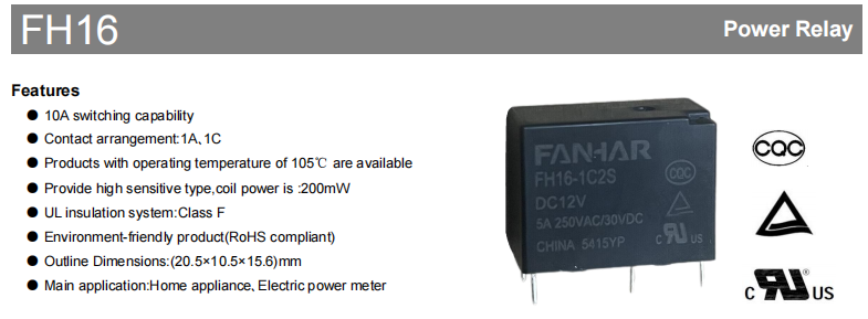The FH16 power relay delivers efficient, safe switching control solutions for home appliances, smart grids, industrial automation, and more through its high performance, reliability, and compact design. It has been certified by UL, TUV, CQC, and other international safety standards. This means that it can be used by different customers. It is a trusted key component in circuit design.