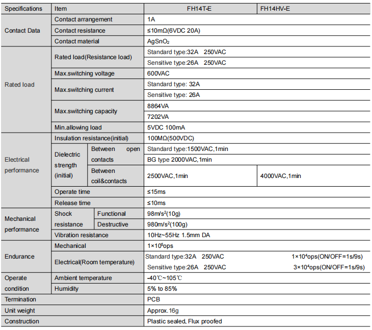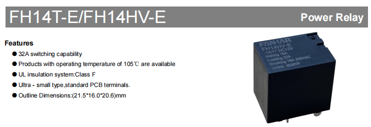 The FH14T-E power relay achieves an exceptional balance between performance, size, and reliability. For demanding applications, its 32A switching capacity, 105°C high-temperature tolerance, and small size make it the perfect option. The FH14T-E provides stable and reliable load control solutions, whether the application is a harsh industrial environment or a space-constrained home appliance design.