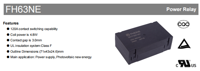 With its high current capacity, high insulation class, fast response, and long-life design, the FH63NE relay is an optimal component for new energy, industrial power supplies, and high-reliability control systems. It complies with multiple international certifications. This ensures good market adaptability and technical competitiveness. It is suitable for applications with stringent requirements for safety, efficiency, and durability.