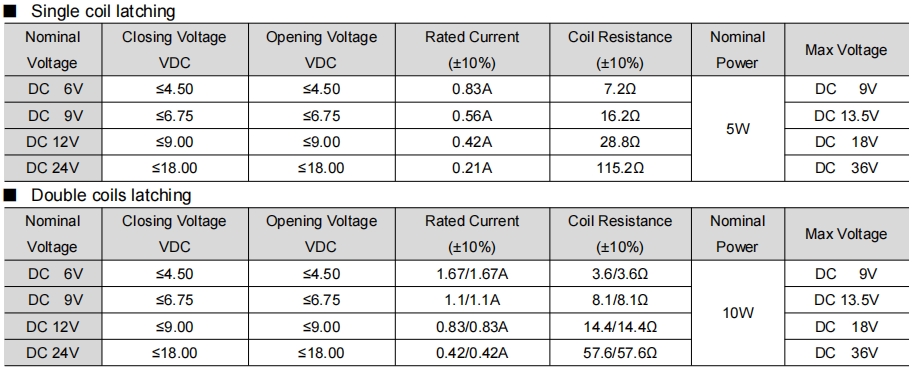 The driving voltage is recommended to be 1~1.5 times of the rated value, pulse width ≥100ms, avoid long time energisation (>1min).