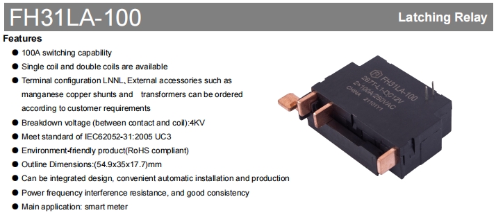 The FH31LA-100 is a high-performance latching relay that can switch 100A of high current. It is designed for smart meters and other uses, and it meets the IEC62052-31:2005 UC3 standard and is RoHS approved.