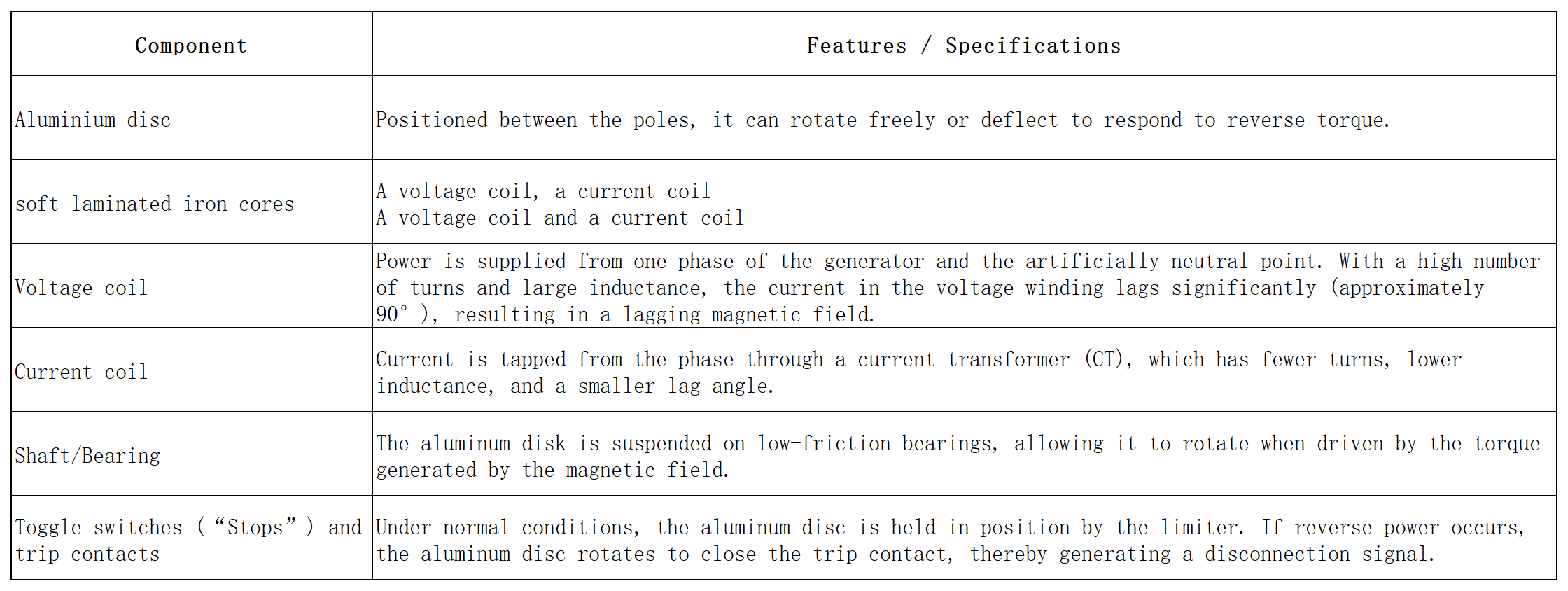 The generator normally outputs power to the busbar. The direction and phase of the magnetic field generated by the voltage coil and current coil cause the torque applied to the aluminum disk to be zero or fixed by the limiter. The trip contacts are open; the relay does not operate.