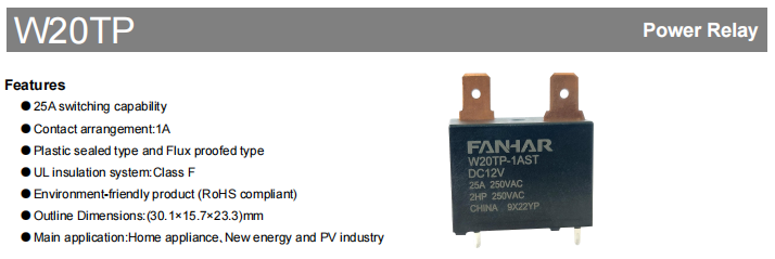 The W20TP relay, featuring a 25A high switching capacity, rapid response attributes, and remarkable environmental versatility, is an optimal control element for home appliances, renewable energy applications, industrial automation, and several other sectors.