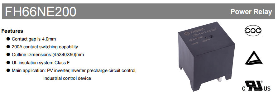 The FH66NE-200 is a latching relay designed for high-reliability industrial and energy applications. The fundamental value resides in the seamless amalgamation of high-current carrying capacity, exceptional insulating safety standards, and robust mechanical performance. It is particularly suitable for fields that demand extremely high reliability in electrical connections, such as photovoltaic power generation systems, industrial automation control, and high-power power management.