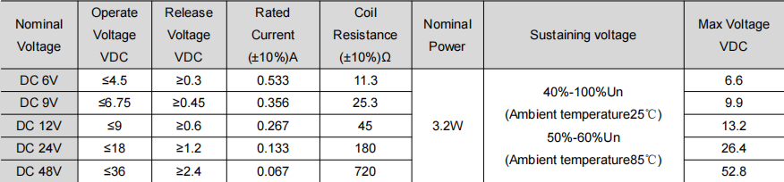 The FH66NE-200 provides several common coil voltage options for seamless integration into diverse control systems, spanning from DC 6V to 48V. Each specification distinctly delineates the exact pull-in/release voltage thresholds, coil resistance, rated power consumption, and explicitly defines the holding voltage range. It enables pulsed energy-saving control, ensuring reliable operation while effectively preventing coil overheating from prolonged energisation.