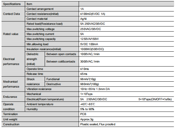 Dielectric Strength: 3000 VAC for 1 minute (between open contacts and between coil and contacts)